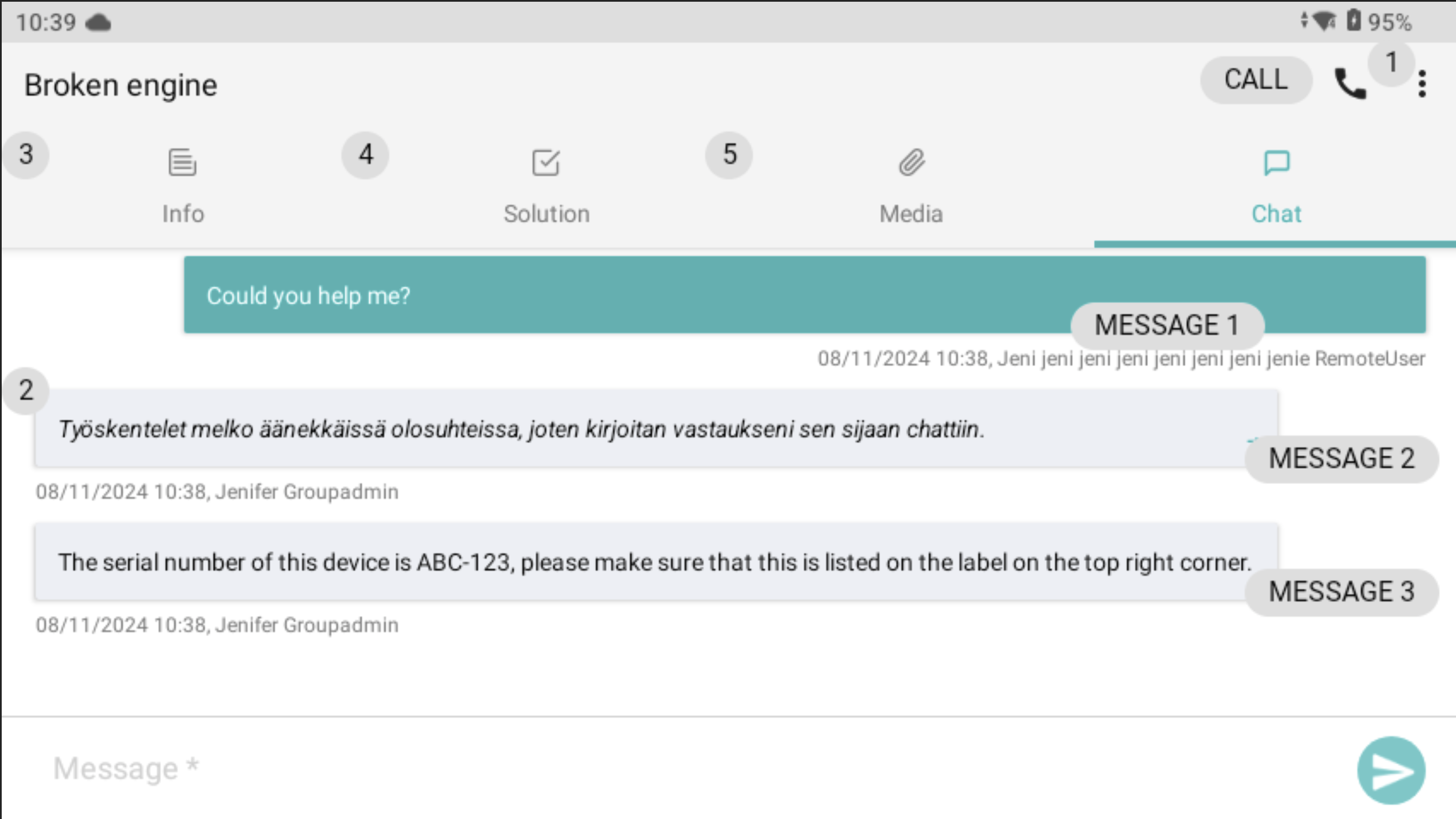 In chat tab you can send messages by saying **`Message`**, inputting your message through voice recognition or Remote keyboard, and send the message with the command **`Send message`**.